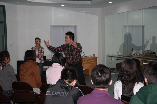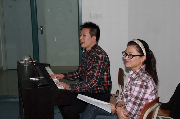 合唱团指导老师为团员进行发声讲解