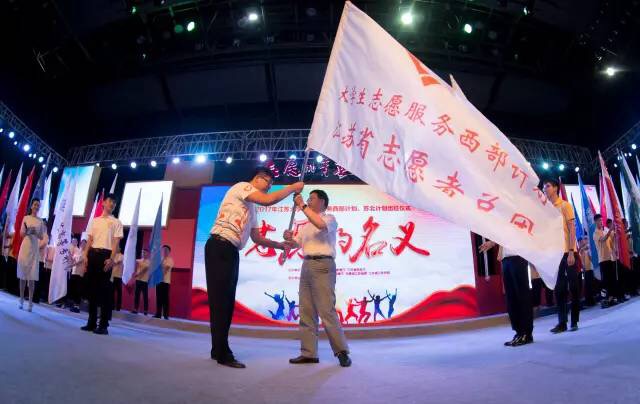 杨根平副秘书长向出征的大学生志愿者授旗。随着杨根平副秘书长的一声“出征”令,参加今年服务西部计划、苏北计划的700多名名大学生志愿者们高喊“出征,出征,我们出征”的口号集体登车,分赴西部、苏北各地服务,开始一年的志愿服务历程。