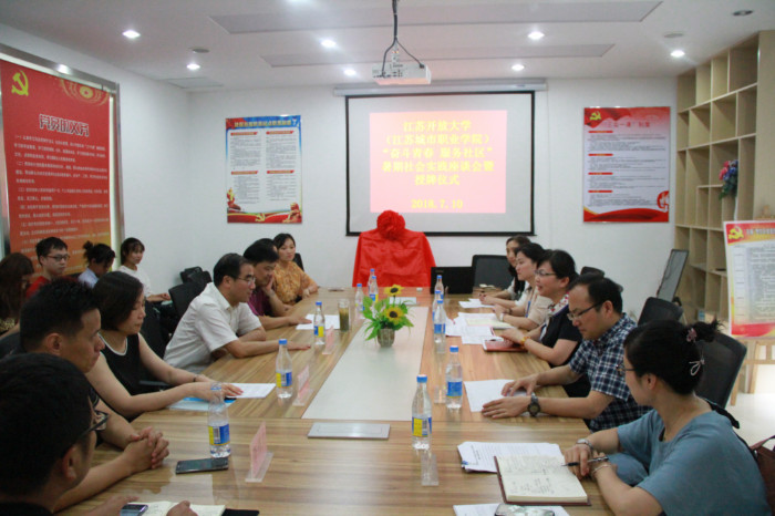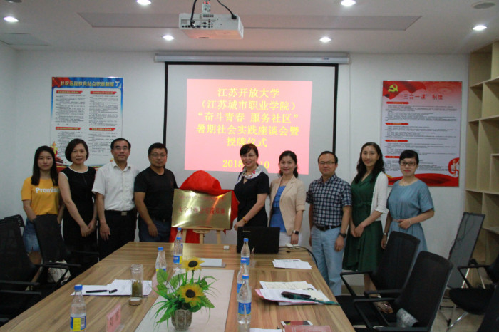 7月10日下午,我校在无锡市梁溪区山北街道惠景社区举办了“奋斗青春·服务社区”暑期社会实践座谈会暨社会实践基地授牌仪式。校党委副书记、副校长金丽霞,校团委书记邹佳,副书记张曌曌,传媒与设计学院党总支副书记袁寿荣,原学生工作处副处长陈希宁;无锡开放大学党委书记刘彬,党委副书记王仁刚等,惠景社区党总支书记戴文梁等,以及参加惠景社区暑期社会实践的学生志愿者们共同参加了社会实践座谈及授牌仪式。