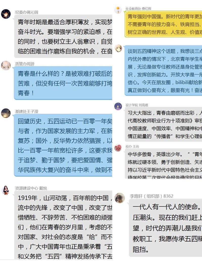 习近平总书记在五四青年节到来之际寄语新时代青年,他指出,青春由磨砺而出彩,人生因奋斗而升华。为了进一步学习领悟习近平总书记重要讲话,弘扬传承五四精神。5月4日,在校团委的指导下,教工团支部开展了线上“五四精神”大讨论活动,校团委副书记尹星以及二十多位教工团员参与了线上大讨论。