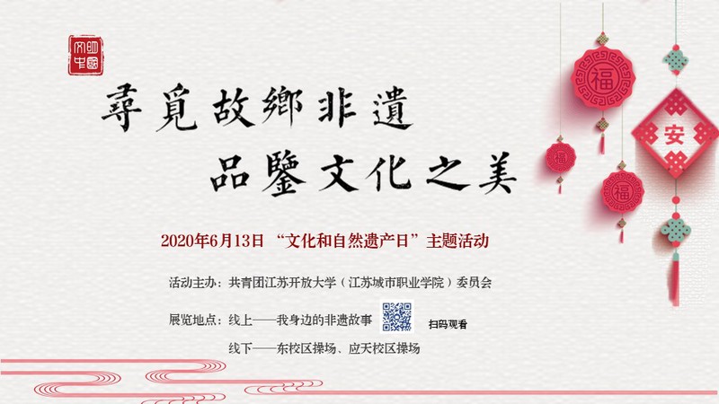 2020年6月13日是我国的“文化和自然遗产日”。文化和自然遗产日源自文化遗产日,定于每年6月的第二个星期六,是中国文化建设重要主题之一,体现了我国对保护文化遗产的高度重视和战略远见。6月13日,为了让同学们学习非遗文化,坚定文化自信,由校团委组织的一场“寻觅故乡非遗,品鉴文化之美”的主题活动拉开序幕。