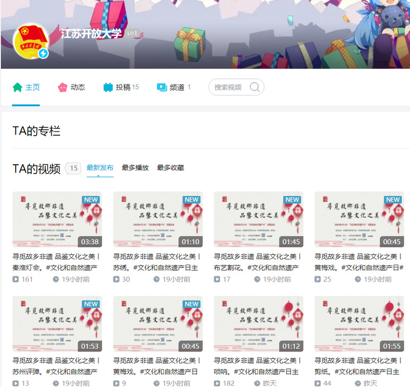 江苏开放大学(江苏城市职业学院)的B站官方账号在此次活动中发布专栏——“寻觅故乡非遗,品鉴文化之美”,里面包括:黄梅戏、川剧、南阳板头曲、中国结等极具地方色彩的非物质文化遗产,分地区由我校来自不同地区的学生代表介绍家乡的非物质文化遗产,自然亲切。而秦淮灯会、苏绣、布艺割花等节日主题活动则采用“展示活动实景+旁白解说”的方式展示,趣味横生。