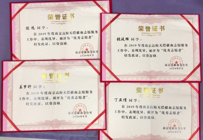 大爱传承美德,热血彰显真情。我校志愿者每年都为献血工作作出志愿服务工作。日前,南京市献血办公室作出了表彰2019年度全市部分高校无偿献血优秀志愿者的决定,我校青年志愿者协会被表彰为全市无偿献血工作优秀志愿团队,并有4名同学获得优秀志愿者称号。