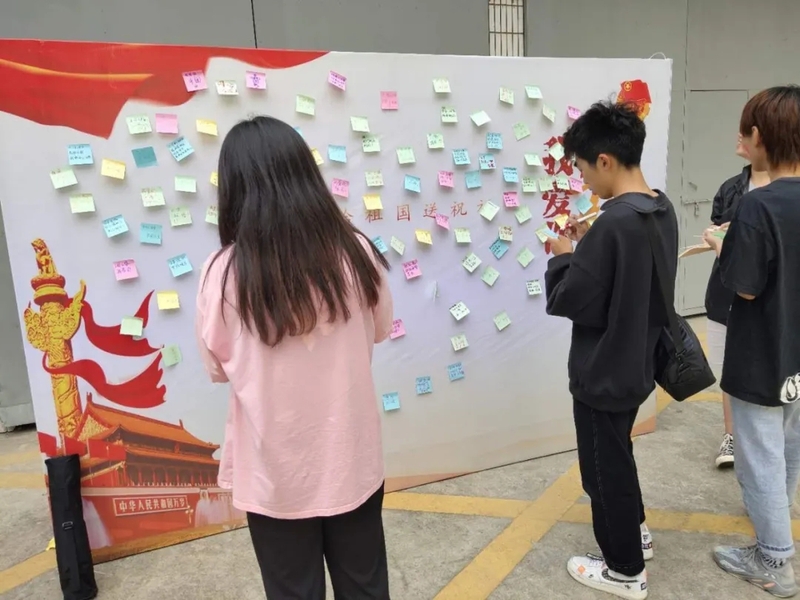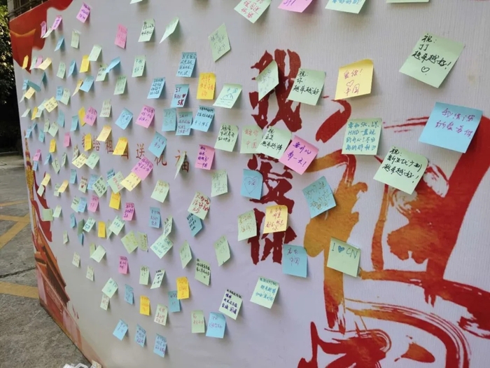 由两校区学生会组织全校师生,在“我爱你祖国”的祝福板上,写上对祖国的祝福以及对家人、朋友、师长的祝福。经历了年初的新冠肺炎疫情,让“家国”这个看似宏大的字眼,显得如此真实而近切。同学们纷纷在祝福展板处驻足,拿笔写下“表白”祖国的话语。“我爱中国!”“我爱开大”这些祝福,被一张张贴在祝福板上五彩斑斓。