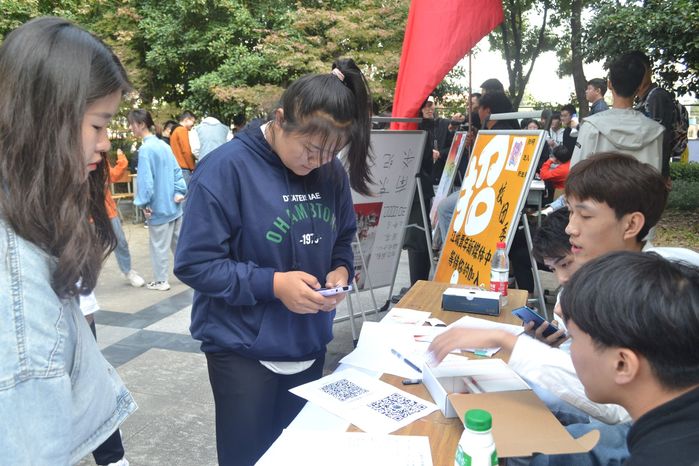 10月19日中午,一年一度的社团招新活动在定淮门东校区和应天校区如火如荼的展开。在活动现场,各社团在自己的招新“摊位”前摆放好宣传展板、展示材料,为了吸引更多新生驻足选择社团。各类社团都拿出自己最有特色的项目展示给大一萌新们。不少参加招新面试的同学在自我介绍时的侃侃而谈,回答提问时的游刃有余,给社团负责人们留下了良好的印象。当然,学生中亦不乏怀揣梦想的初生牛犊,他们同样用自身的实力和强烈的愿望,去展示自己想要加入社团的意愿。