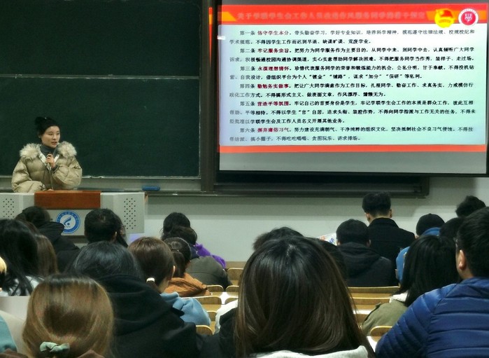 校学生会指导老师宋敏宣布了新一届主席团人员和干部人员,并对新一届学生会提出了几点工作要求。首先,突出组织的政治属性,要深刻贯彻团中央、团省委下发的文件精神,要增强工作的政治性,树立远大理想,坚定“四个意识”;其次,要紧扣时代要求,把握青年工作特点和规律,深化改革创新,组织动员广大青年和青年学生坚定跟党走、奋进新时代,为党和国家事业发展作出新的更大贡献。再次,学生会工作要凸显服务宗旨,团结青年、引领青年、服务青年,广泛开展教育实践活动,践行服务宗旨,提高同学满意度。最后,要深化和聚焦组织改革,务实工作实效,提高大局贡献度,从严治会,纵深推进改革,强化制度建设、队伍建设、活动计划,真正提高社会美誉度。