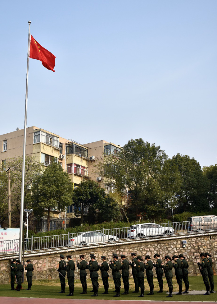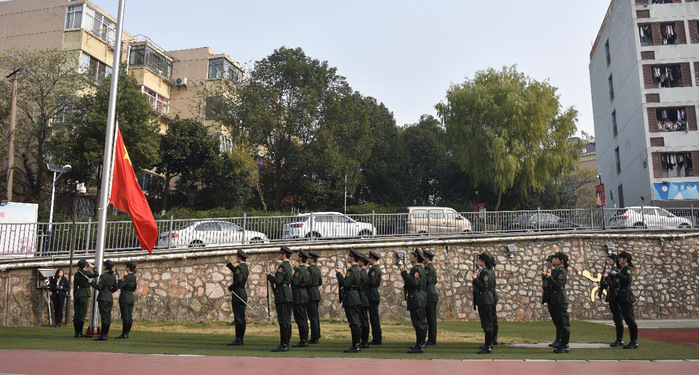 上午10:01,当防空警报响起,我校国旗班举行升降半旗仪式,全体学生肃立,为南京大屠杀死难者通报默哀一分钟。