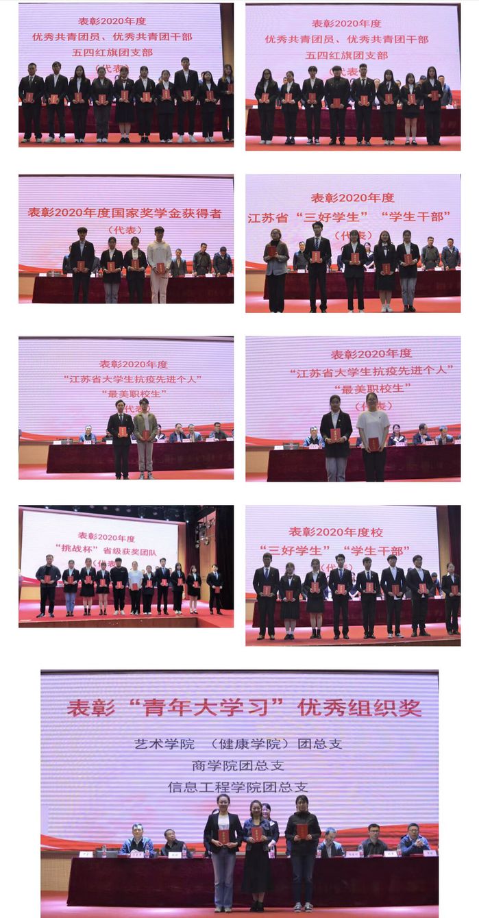 大会在雄壮的国歌声中来开帷幕。校团委副书记尹星宣读了《关于表彰2020年度“优秀共青团员”、“优秀共青团干部”、“五四红旗团支部”的决定》、《关于对2020年度国家奖学金获得者的表彰通报》、《关于对2020年度江苏省普通高校省级三好学生、优秀学生干部获得者的表彰通报》、《关于对2020年度“江苏省大学生抗疫先进个人”及“最美职校生”的表彰通报》、《关于对2020年度第十一届“挑战杯”省级获奖团队的表彰通报》、《关于表彰 2019-2020 学年“三好学生”、“优秀学生干部”的决定》和《关于表彰“青年大学习”优秀组织奖的决定》等表彰文件,对2020年我校共青团组织中表现突出的集体和个人进行了表彰。