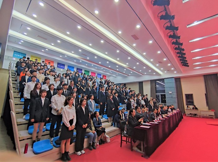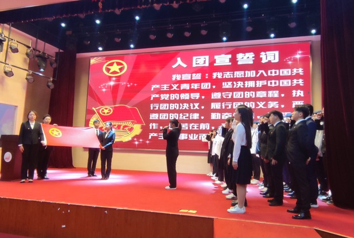 在入团宣誓环节,台上新团员在团旗下,严肃且庄重地进行入团宣誓;台下老团员全体起立,重温入团誓词,回顾团员使命。会场上铮铮誓言铿锵有力,庄严承诺掷地有声,激发全体团员青年坚定理想信念,弘扬“五四”精神,努力拼搏的决心。