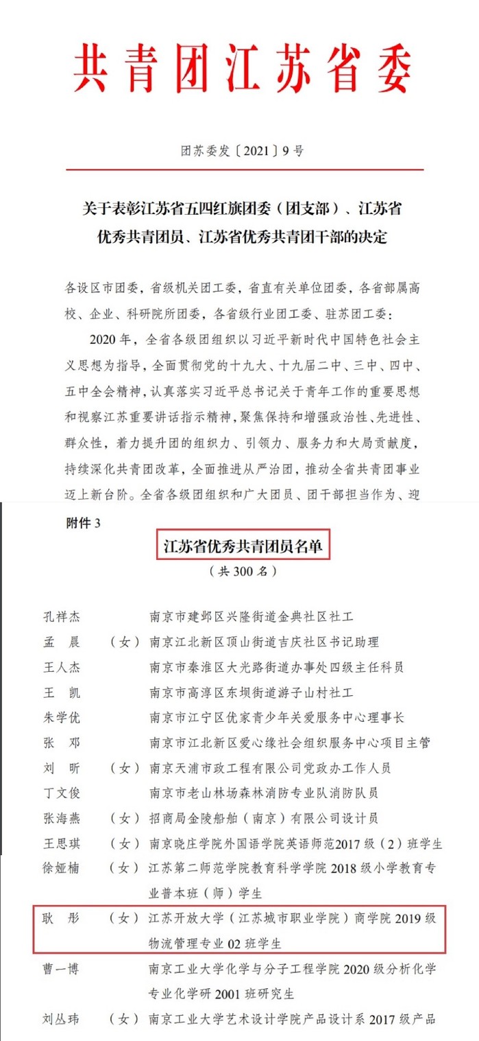 近日,共青团江苏省委下发了《关于表彰江苏省五四红旗团委(团支部)、江苏省优秀共青团员、江苏省优秀共青团干部的决定》(团苏委发〔2021〕9 号),我校商学院耿彤同学荣获“江苏省优秀共青团员”称号。