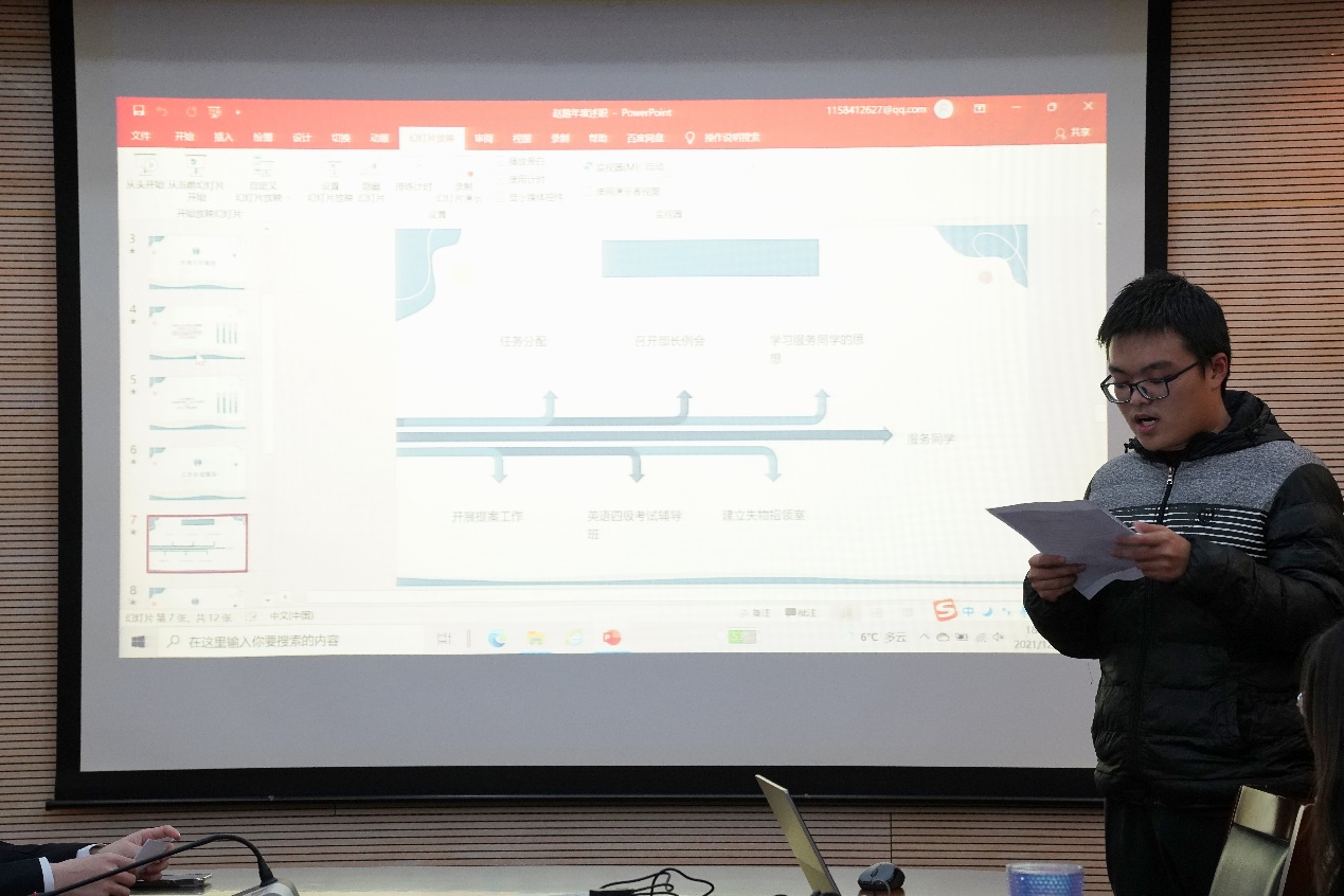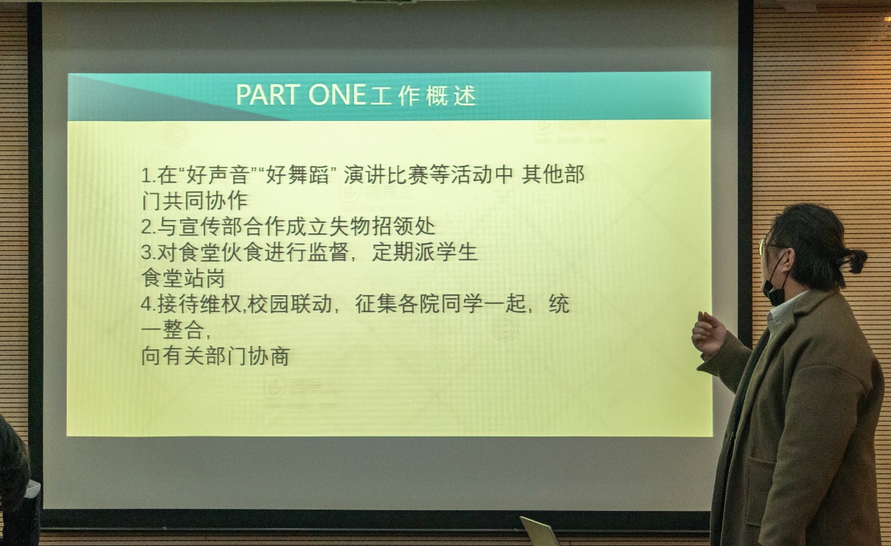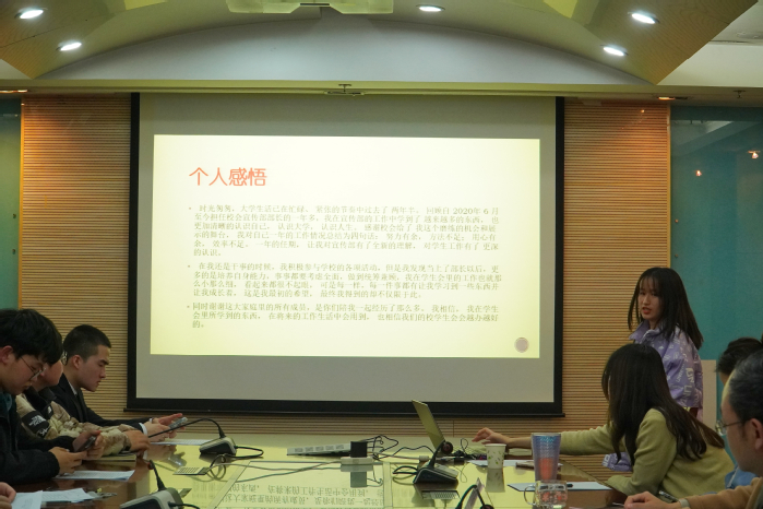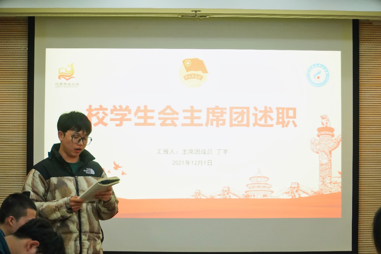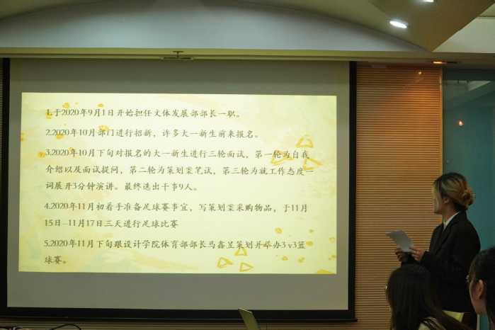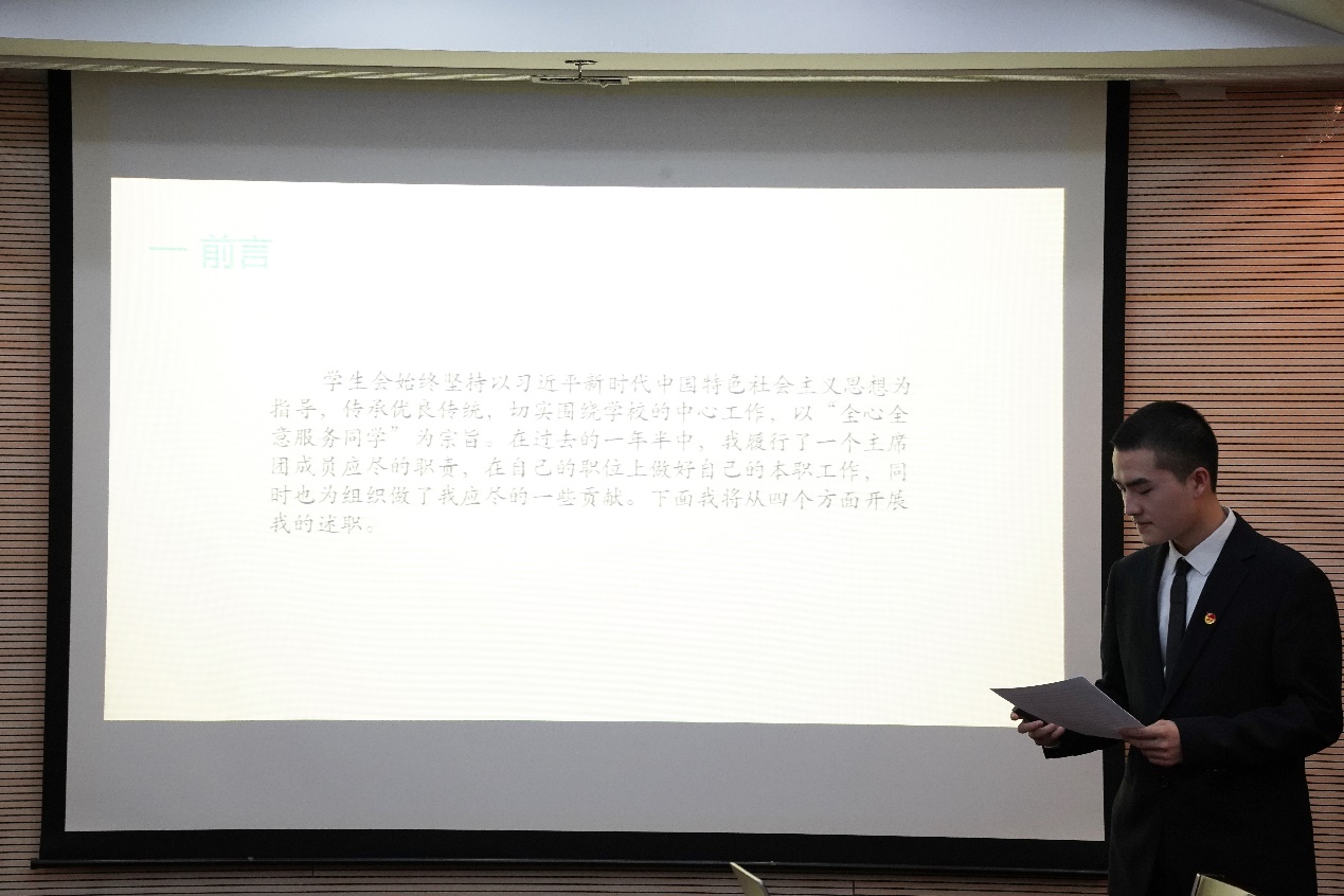 现场述职先由5位主席团成员进行,随后由10位部长依次进行,具体的顺序按照各位同学的姓氏笔画顺序排列。