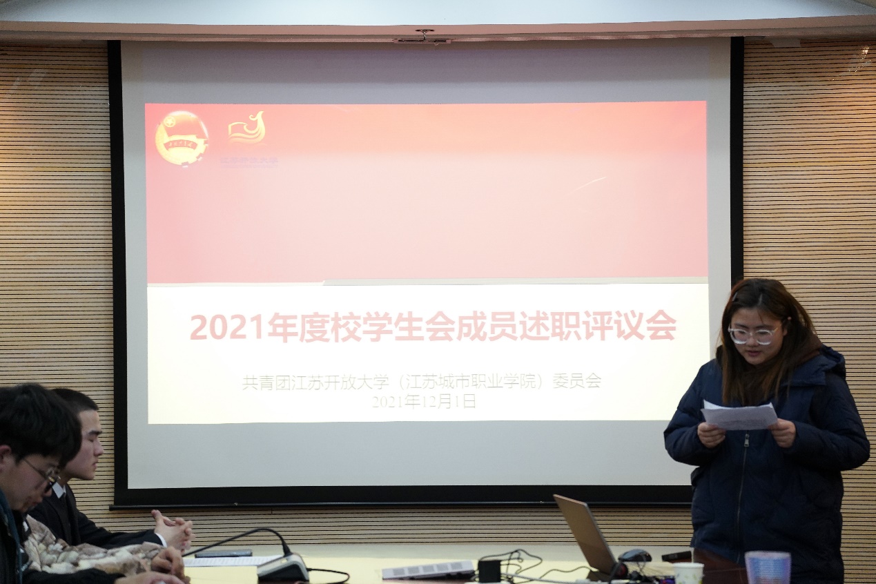 2021年12月1日晚18点30分,江苏开放大学(江苏城市职业学院)学生会2021年度述职评议会在应天校区教学楼306教室召开。我校校学生会的5位主席团成员与5个部门的部长共计15人参与本次述职,本次述职评议会的评审由校党委组织部部长韩承辉、校党委学学生工作部部长刘涛、校团委副书记尹星担任,评议小组成员对校会成员们的述职表现进行打分。