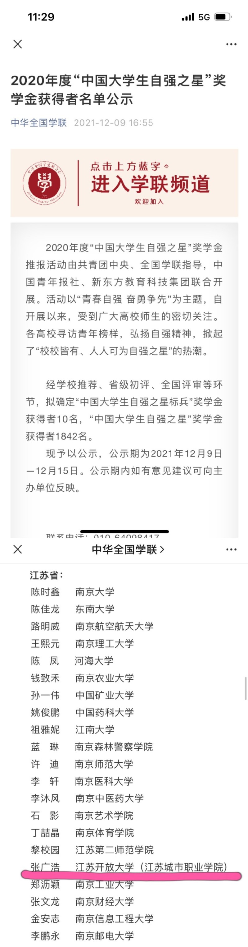2021年9月,经本人申请、学院推荐和学校评审,拟确定张广浩同学作为我校2020年度“中国大学生自强之星”奖学金省级候选人的推报人选。2021年12月,张广浩同学荣获2020年度“中国大学生自强之星”奖学金。