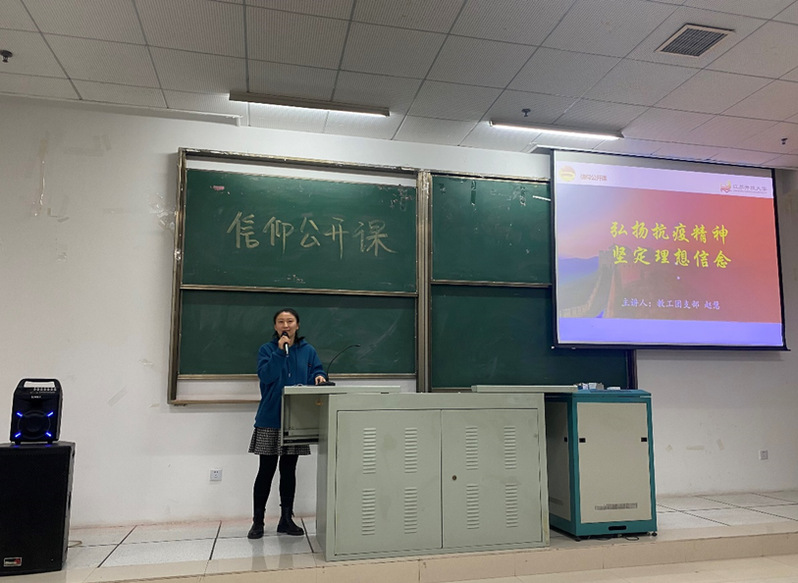 赵慧以“弘扬抗疫精神,坚定理想信念”为题,为学生介绍了中国人民在抗击新冠肺炎疫情斗争中彰显出的中国精神、中国制度、中国力量和中国速度,并重点分享了抗疫一线的一名00后志愿者苏纯欣的亲身经历,让大家一起感悟这场战役当中孕育并诞生的抗疫精神,以及新时代赋予青年群体的责任与担当、理想与信念。