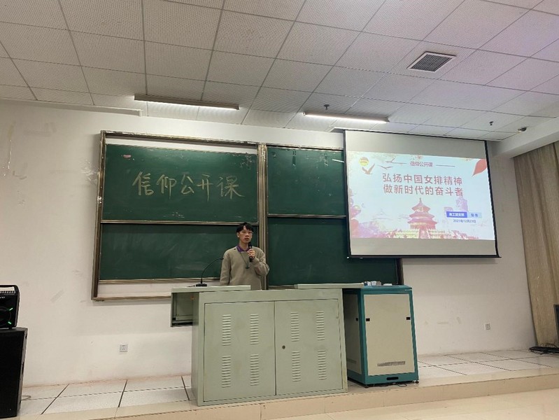 张伟以“弘扬中国女排精神,做新时代的奋斗者”为题,以党的十九届六中全会精神为指引,从女排精神的形成、内涵及时代再诠释等方面为同学们展现了一幅中国女排四十余年的奋斗画卷。作为被第一批纳入中国共产党人精神谱系的伟大精神之一,女排精神是民族精神与时代精神的集中体现,是中华民族的宝贵精神财富。最后,张伟勉励同学们积极响应和落实习近平总书记的号召,大力弘扬新时代的女排精神,勇做新时代的奋斗者。