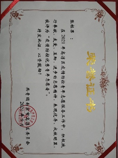 2021年暑假参与红色长征路社会实践,在红色文化中学党史、强信念、跟党走,努力成为担当民族复兴大任的时代新人。同时我他也是积极参加疫情防控工作,负责引导、答疑、宣传、测温等后勤工作,荣获高淳区疫情防控优秀青年志愿者。
