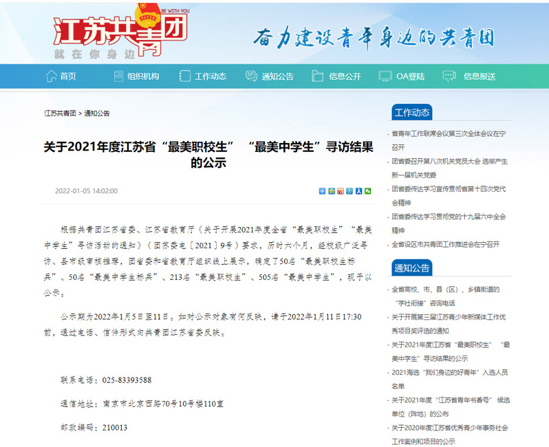日前,2021年度江苏省“最美职校生”“最美中学生”寻访结果公示,我校周靖崴、兰露露、张广浩三位同学,荣获江苏省“最美职校生”荣誉称号。