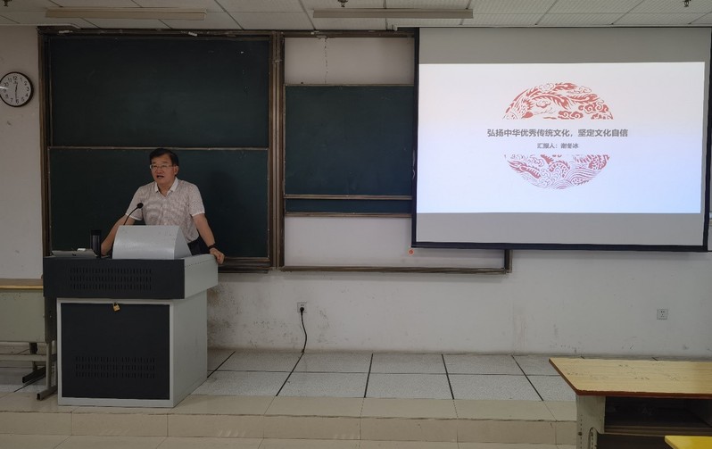 谢馆长向大家作了以《弘扬中华优秀传统文化,坚定文化自信》为题的报告,主要从“弘扬优秀传统文化的时代意义”“文化源头:神话中的文化精神”“中华优秀传统文化精神”三方面进行讲解。谢馆长首先选取了习近平总书记在党的十九大、2014年文艺工作座谈会以及党的十九届六中全会上的三次重要讲话中有关“中华传统文化”的内容,阐释了当下弘扬优秀中华传统文化的时代意义。关于文化起源,谢馆长从神话入手,通过中西方不同的神话故事来对比中国神话中的尚德精神与西方神话中崇尚智慧、力量之间的差异,以展现“尚德精神”在我国传统文化发展中起到的积极作用。最后,谢馆长选取“天人合一”“人际和谐”“邻邦和谐”“以人为本”四个例子,为大家详细讲述中华优秀传统文化精神。整场报告生动有趣,内容详实,题材新颖,为大家呈现了一堂精彩的文化思政课。