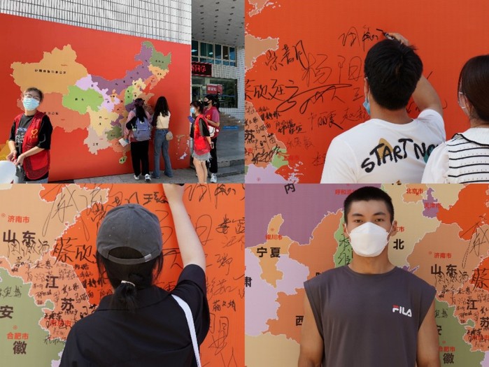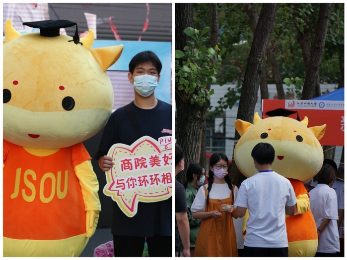 大家分工明确,秩序井然。校学生会代表校团委,主要负责为新生们介绍团委、学生会、学生活动等等,并给他们发放《校园宝典》手册。除了这些常规工作,今年,校学生会还制作了我校吉祥物牛momo背景板、全国地图和具有我校特色的手持式展板供萌新们签名、拍照打卡;同时,还在校会摊位上设置了“爱心传递”邮箱,让萌新们通过小小一张明信片,来传递将这份开学之初的“憧憬、懵懂、期待”之情。