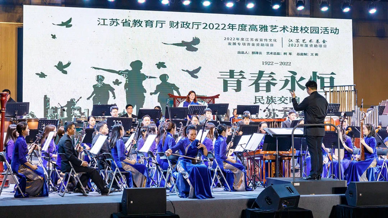 青春恰似火扬帆正当时。11月16日晚,江苏省教育厅、江苏省财政厅2022年度高雅艺术进校园活动走进我校,江苏省演艺集团民族乐团为我校师生带来了“以民乐之美,颂青春之志”的原创民族交响《青春永恒》。校党委副书记、副校长金丽霞、中层干部、教师代表和800名学生共同聆听了此次音乐会。