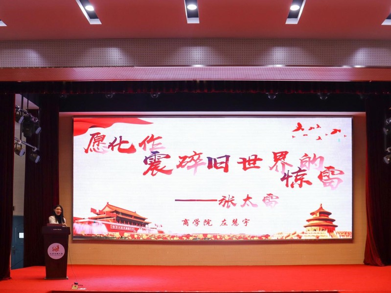 左慧宇以“愿化作震碎旧世界的惊雷——张太雷”为主题,向大家讲述中国共产党早期重要领导人、中国共产主义青年团创始人张太雷的故事。从百年前青年团领导人的风华,再到如今新时代青年人的作为,左老师号召广大青年要始终与党同心、跟党奋斗,在民族复兴征程上勇当先锋、倾情奉献,发挥生力军和突击队作用,让青春在祖国和人民最需要的地方绽放绚丽之花。