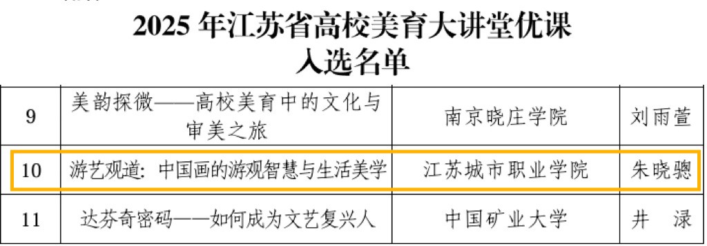 在省教育厅最近公布的“江苏省美育大讲堂优课入选名单”中,我校艺术学院朱晓骢老师优课作品《游艺观道:中国画的游观智慧与生活美学》入选。本年度美育大讲堂优课评比共有85所高校参与,推荐了134件作品,朱晓骢老师作品经初评、复评,最终入选(仅30件)。该作品将在省教育厅美育智慧平台进行展播并赴其他高校授课。